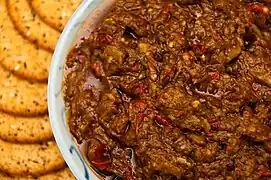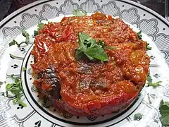 | Mets similaires | Caviar d'aubergine, taktouka, hmiss, chakchouka, frita, poivron grillé, ratatouille, bohémienne, piperade, caponata |