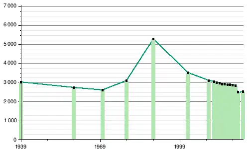 La commune a subi une perte de population entre 1939 et 1970, passant de 3 006 à 2 605 habitants . Mais ensuite, elle a connu une augmentation rapide et forte, atteignant 5 306 habitants en 1989, ce qui constitue le plus haut pic démographique de son histoire. Depuis cette date, la population ne cesse de baisser, avec seulement 2 515 habitants en 2023, selon les estimations.