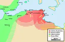 Diverses branches zirides vont régner sur le Maghreb central, mais aussi sur la Taifa de Grenade en Al-Andalus. C'est ainsi qu'au début du XIe siècle, à la suite de diverses contestations familiales, la branche des Hammadides fait sécession et prend le contrôle des territoires du Maghreb central. Les Zirides proprement dit sont alors désignés comme Badicides et n'occupent plus que l'Ifriqyia (actuelle Tunisie et est algérien) entre 1048 et 1148[9]. Une partie fuit en Al-Andalus et fonde plus tard, en 1019, le royaume de Grenade sur les décombres du califat de Cordoue[10]. Les Zirides de Grenade sont défaits par l'expansion des Almoravides, qui annexent leur royaume en 1090[11], tandis que les Badicides et les Hammadides demeurent indépendants[10].