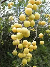 L'inflorescence, axillaire, tomenteuse, est portée par un pédicelle laineux, d'environ 3 à 5 mm de long. Les fleurs, hermaphrodites, subsessiles, de 4 à 6 mm de diamètre, de couleur jaune verdâtre, sont parfumées. Le calice, d'environ 1 mm de long, est formé de sépales carénés à l'intérieur, pubescents, ovales, plus ou moins aigus. La corolle est composée de cinq pétales spathulés, de 1,25 à 1,5 mm de long. Les styles sont courts et bifides. Le disque intrastaminal assez épais présente 10 lobes. L'ovaire est biloculaire. Le fruit est une drupe globuleuse, rouge-jaune à jaune-vert contenant un noyau dur entouré d'une chair comestible, de 10–30 mm de diamètre[3].