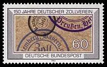 Au niveau des devises, deux systèmes monétaire prédominent dans la Confédération germanique, dans le sud c'est le gulden (florin), au nord du Main le taler. Mais, depuis 1754, il existe une unité commune, le konventionstaler, qui reste la première tentative d'harmonisation des monnaies dans la Confédération germanique. Les villes hanséatiques utilisent quant à elles le mark (en)[réf. nécessaire]. Dans les années 1820, la Prusse rejoint le système basé sur le taler. Le Zollverein incite à plus d'harmonisation en faveur du taler prussien, à partir de 1834[56]. Cet objectif n'est certes que partiellement atteint, mais les traités d'équivalence monétaires permettent une relative unité du système monétaire[57].
