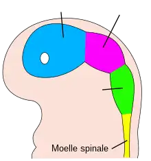 Après la gastrulation, l'embryon est complètement indifférencié et nécessite de nombreux signaux différents pour initier une différenciation appropriée du corps. Le haut (plaque de toit, sur la face dorsale de l'embryon) et le bas (plaque de sol, sur la face ventrale) jouent un rôle crucial dans ces premières étapes : chacun agit par une signalisation globale (signalisation dans tout l'embryon) pour la structuration neuronale dorsoventrale . Une fois le développement de l'axe dorsoventral terminé, une signalisation plus locale se produit dans le cerveau en développement : les limites du développement telles que la limite mésencéphale-cerveau postérieur (MHB), les rhombomères et la ZLI aident à l'organisation antéropostérieure. [5].