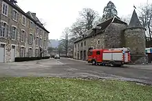 Camion des pompiers d'Hamoir, sortant de la caserne.