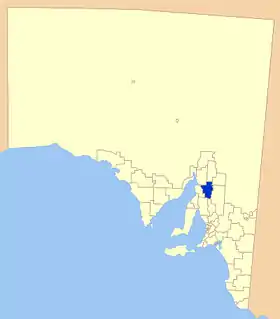 | Ville d'Adélaïde | Adelaide | 1840 | 16 km² | 1592 | 22 143 | 24 794 | Capitale de l'Australie-Méridionale 1840 : fondée sous le nom de « Municipalié d'Adelaïde » (Adelaide Corporation) 1843 : Administrée par le gouvernement colonial, puis par une commission 1852 : Refondation 1919 : Office of Mayor élevé au rang de Lord Mayor | ![]() |