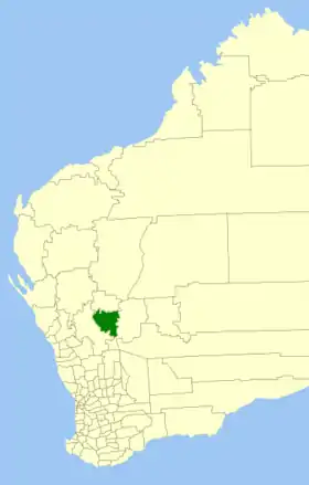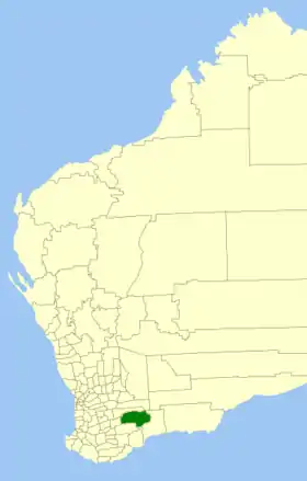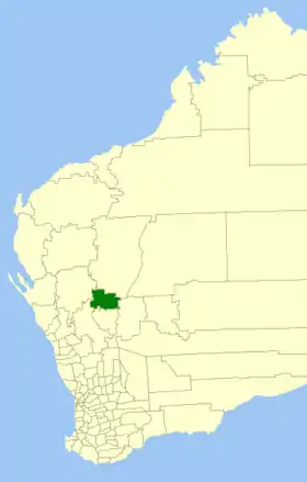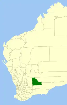 | Comté de Coolgardie | Coolgardie | 1921 | "Coolgardie Municipal Council" (1894) et "Coolgardie Road Board" (1896) ont fusionné à la fin de 1921. | 30 400 km² | ![]() |