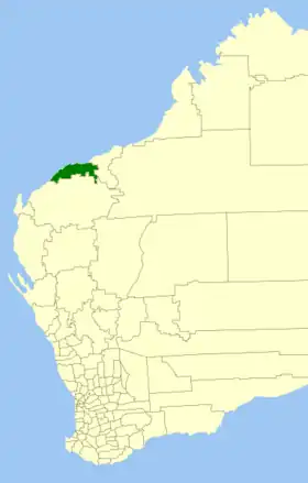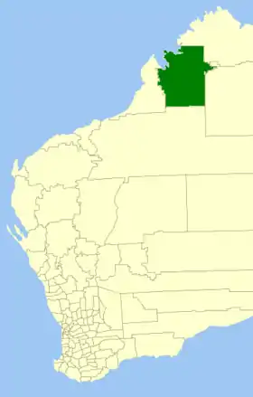 | Comté de Derby-West Kimberley | Derby | 1884 | Le "West Kimberley Road Board" (1884) fut renommé en 1983. | 104 080 km² | ![]() |