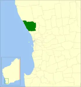 | Ville de Cambridge | Floreat | 1993 | La région faisait autrefois partie de la "Nedlands municipality", créée en 1901 et qui fut absorbée par la Cité de Perth en 1915. En 1993 le gouvernement de l'État décida d'éclater la "Cité de Perth" en créant à côté d'une "Cité de Perth" de taille réduite trois autres zones: Ville de Vincent, Ville de Cambridge et Ville de Victoria Park. | 22 km² | ![]() |