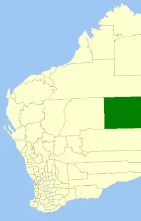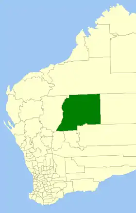 | Comté de Wiluna | Wiluna | 1909 | Le "Wiluna Road Board" fut créé en 1909. On 1er juillet 1993, the eastern half of the Shire abutting the State's border with the Northern Territory was incorporated as the Shire of Ngaanyatjarraku. | 184 000 km² | ![]() |