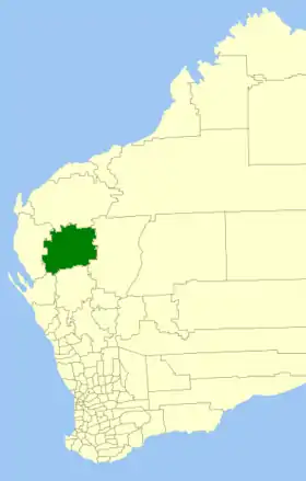 | Comté de Perenjori | Perenjori | 1916 | Le "Perenjori-Morawa Road Board" fut créé en 1916 à partir de terres venant de l'"Upper Irwin Road Board". En avril 1928, l'entité fut séparée en deux, les futurs comté de Perenjori et comté de Morawa. | 8 214 km² | ![]() |