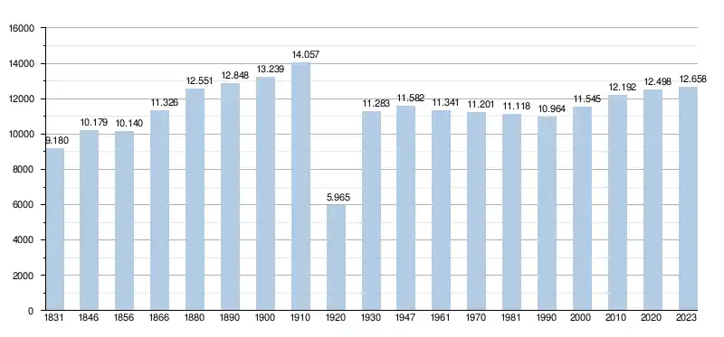 Elle comptait, au , 12 741 habitants (6 422 hommes et 6 319 femmes), soit une densité de 188,67 habitants/km²[4] pour une superficie de 67,53 km².