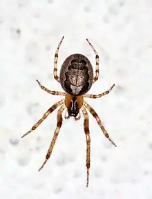 Le prosome est brun jaune avec un motif gris brun (le milieu un peu argenté) en forme de feuille sur l'opisthosome.
